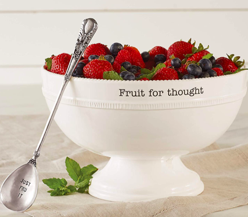 - Fruit Bowl : Okay so I have a slight addiction to collecting the brand Mud Pie serving ware. It all started with our wedding when my great aunt got me tonssssss of serving pieces to start a collection. Now I’m hooked and love to find new and hilarious dishes to add to the collection. The best part is that they are all simple creamy off white ceramic dishes so they go with just about everything. My family always loves when I pull out the “fancy” serve ware, and we all get a good laugh from the silly sayings on each of them.