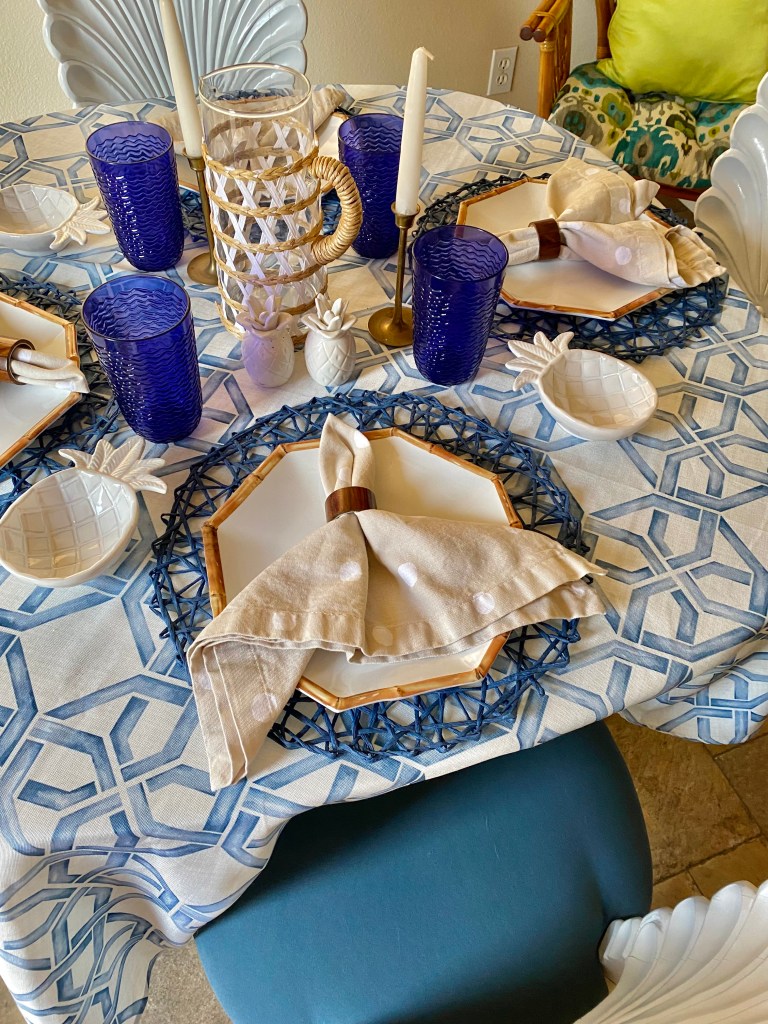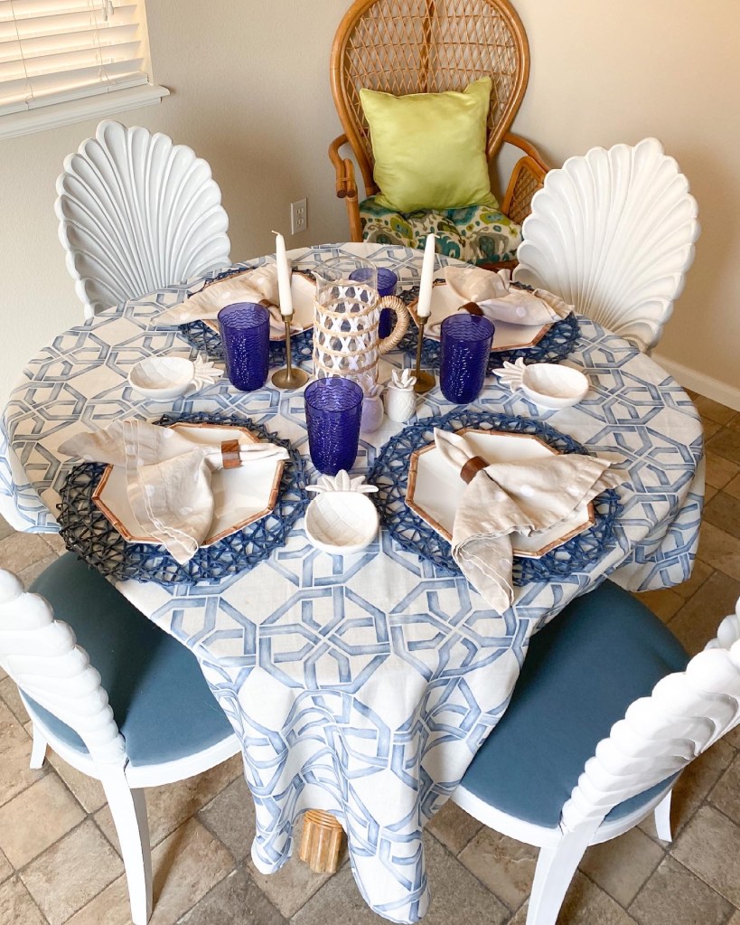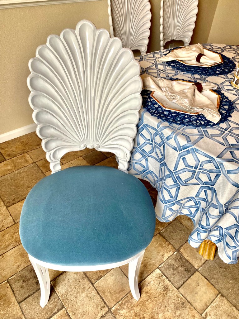 If you have been following me a while then you know I love decor, tables-capes, and vintage furniture. I put together a blue and white table for the month of June and finally had my vintage grotto shell back chairs upholstered in a beautiful performance velvet harbor blue material from Ballard Designs. Check out Junes table scape!