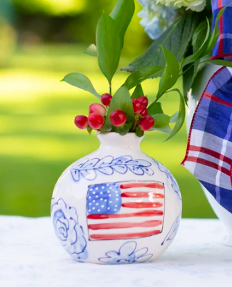 Reversible Ball Vase: I recently started purchasing pottery items for again another small woman owned company here in the US all pieces are hand made and hand painted in small batches and limited quantities. For Petes Sake Pottery has the most darling unique items and I like to get a piece for each holiday for my entry table, that I have too much fun decorating each season. I really like this little vase because you can spin it around and leave it out for after the fourth of July to just display floral pattern instead of the flag. It is such a cute addition to my little collection ๐